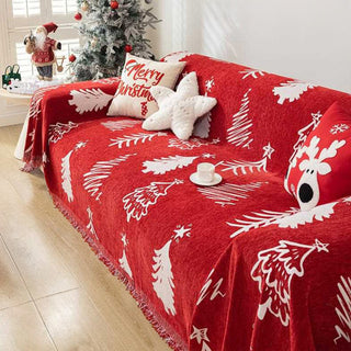 Copridivano in ciniglia Merry Christmas, rosso festivo con motivo ad albero e stella per decorazioni natalizie